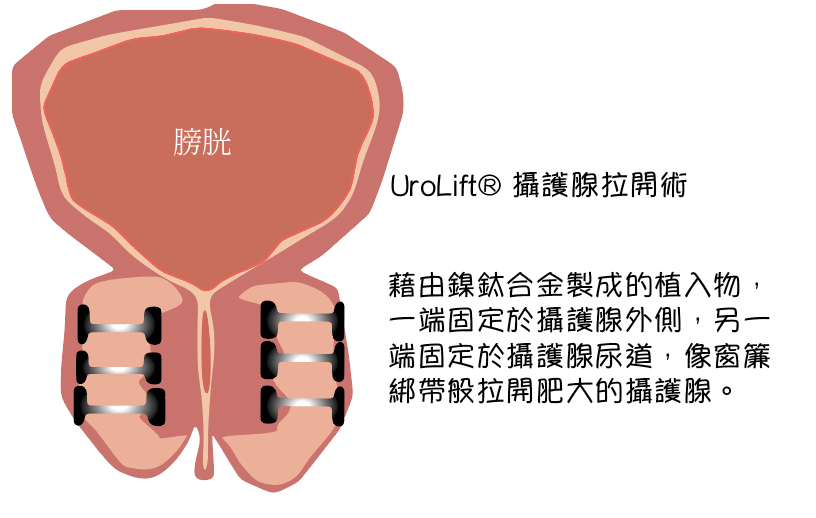 利用 鎳鈦合金植入物,將肥大的攝護腺兩側「拉開固定」,像窗簾綁帶一樣,解除尿道壓迫。